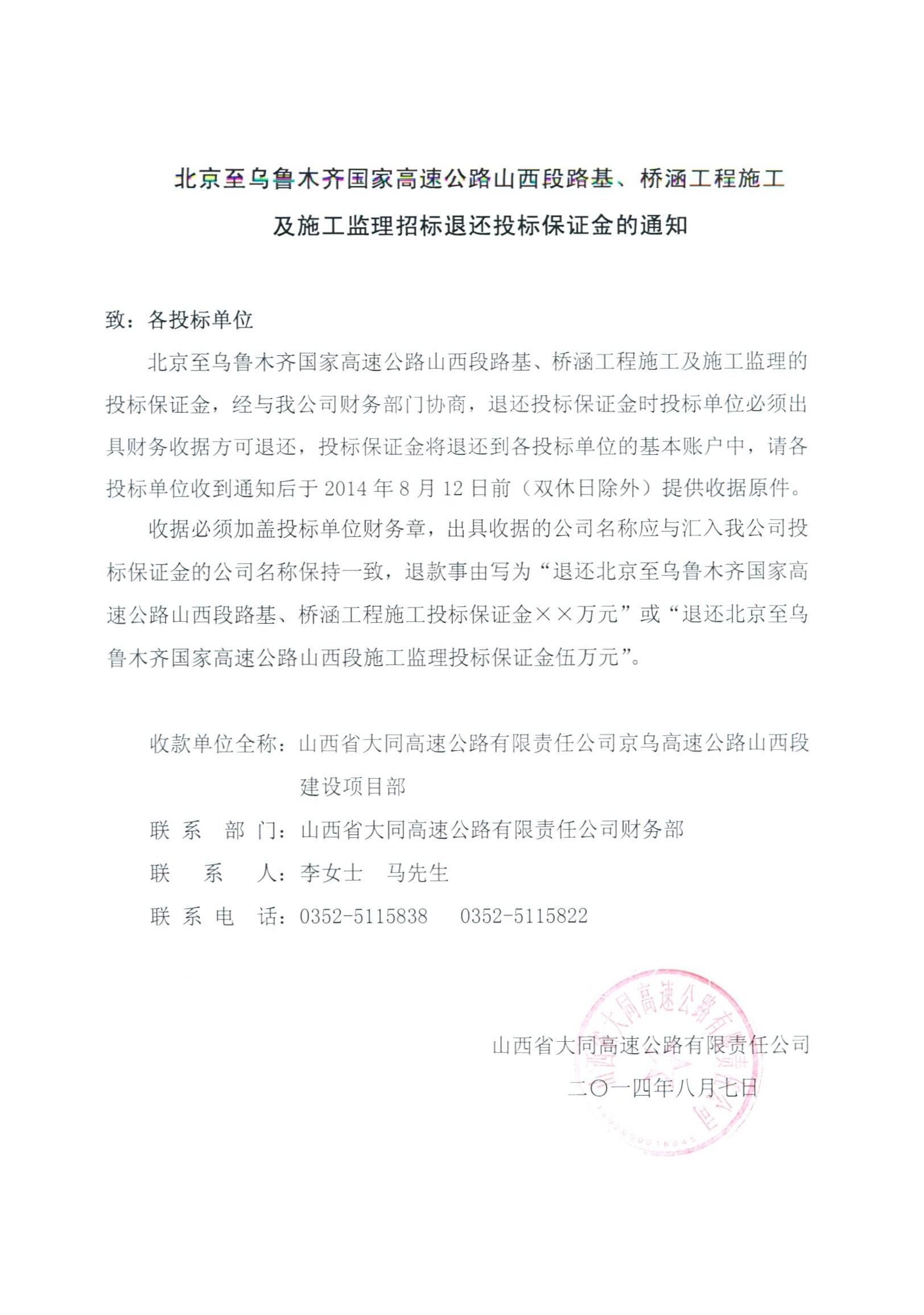 北京至烏魯木齊國家高速公路山西段路基、橋涵工程施工及施工監(jiān)理招標(biāo)退還投標(biāo)保證金的通知